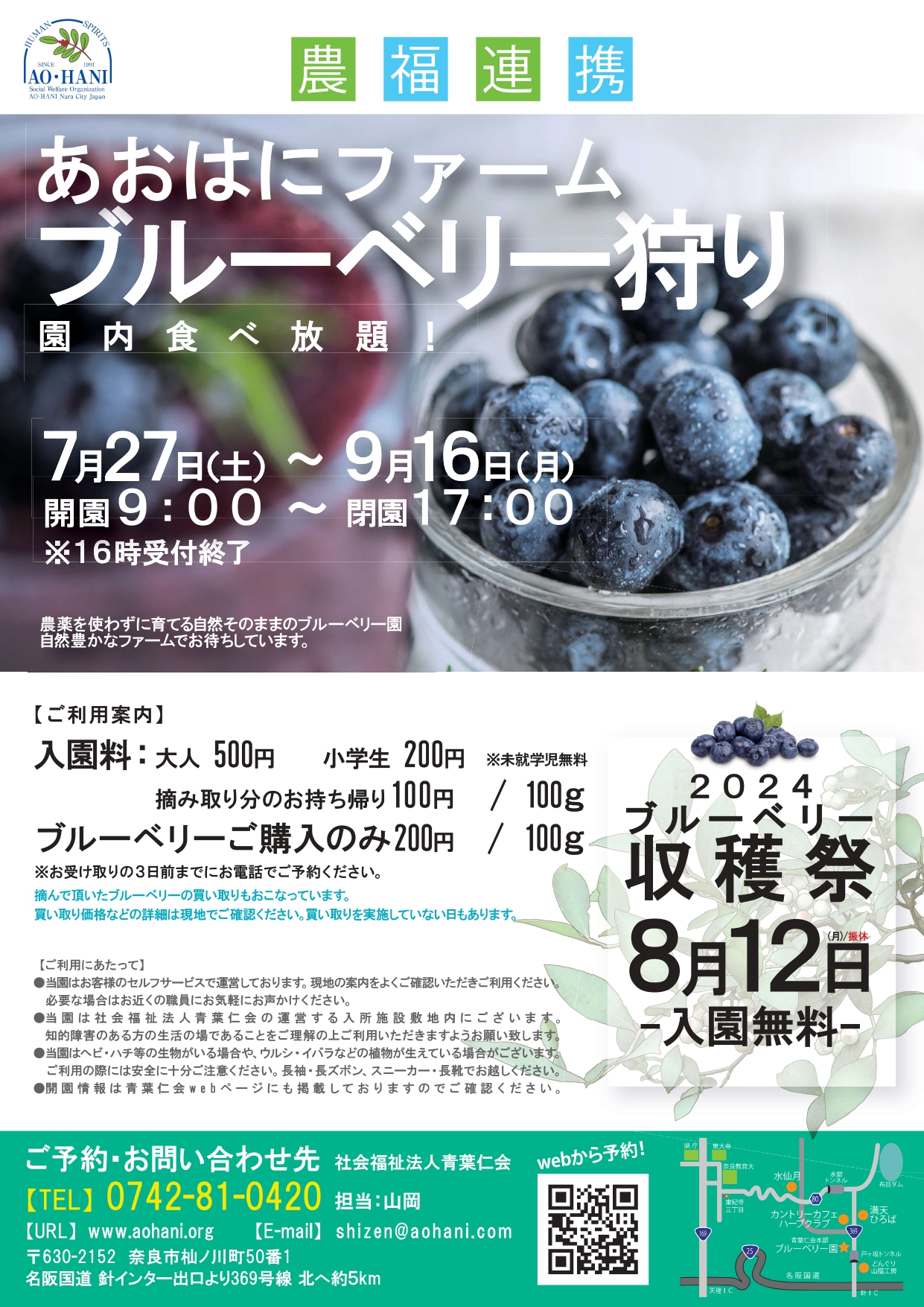 場所:社会福祉法人 青葉仁会 本部 あおはにファーム・ブルーベリー園(奈良市杣ノ川町50-1)