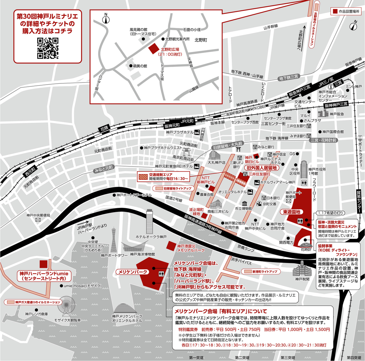 以前のように旧居留地の大丸前から市役所隣の東遊園地まで直線道路を一方通行でゆっくり歩くスタイルから、3つの拠点に会場が分散される回遊型スタイルに変更。