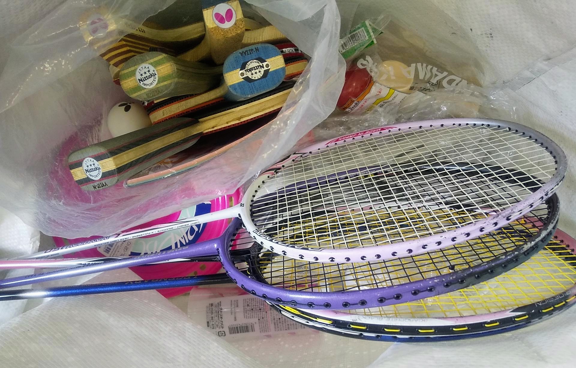ラケット/4本……競技用、コントロール重視の初心者向けのモデル。炭素素材使用で飛びやすいです。新品なら7000円~1万円弱。すべて中古。