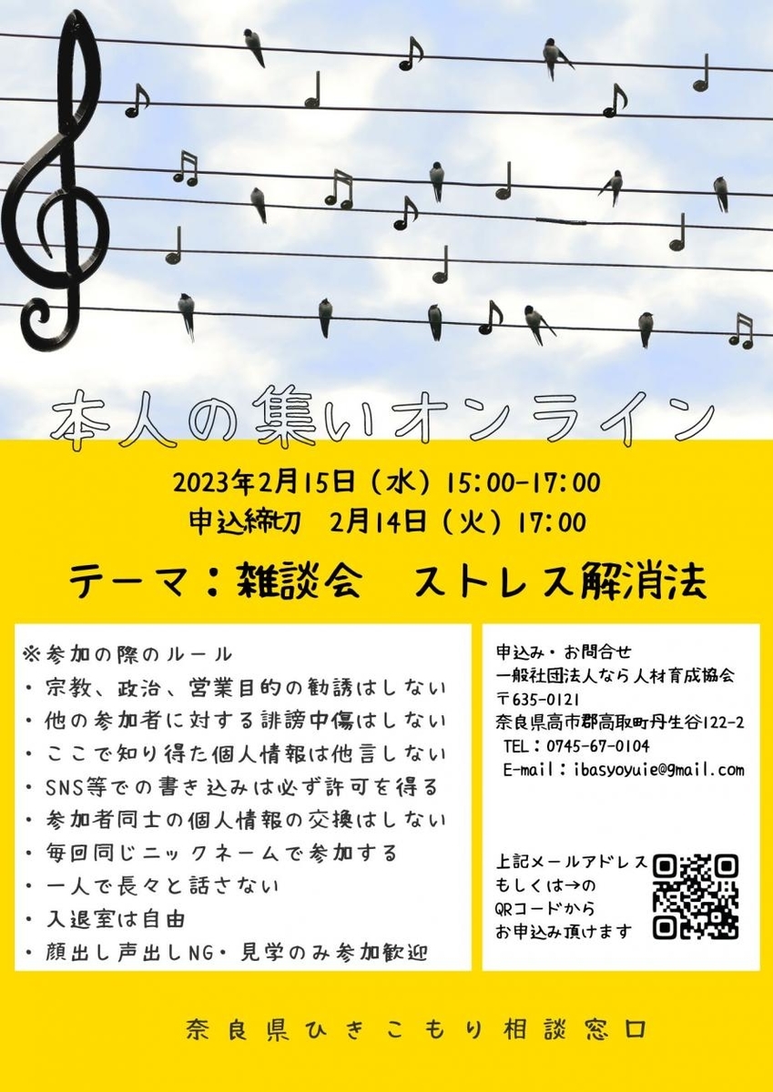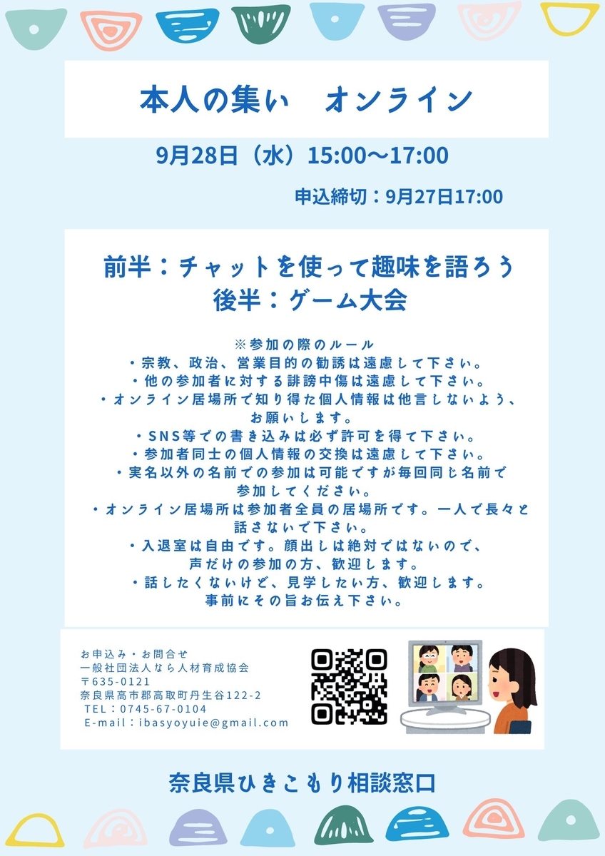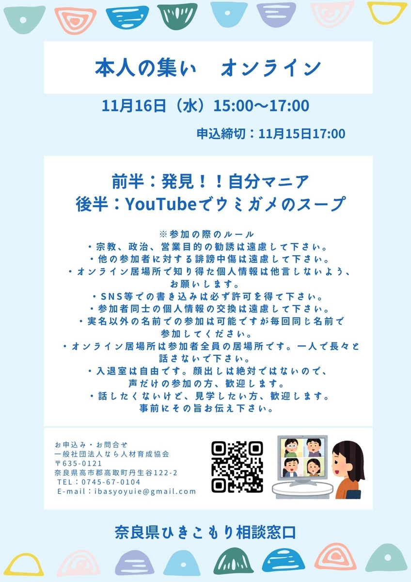 ※「奈良県ひきこもり相談窓口」のプラグラム等は通常は住民対象ですが、このオンラインの集まりについては全国どこにお住まいでも構いません。