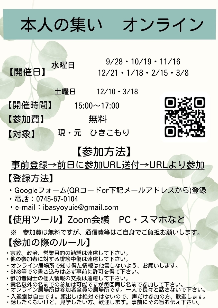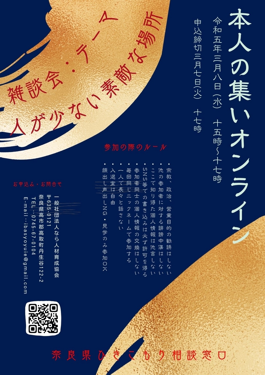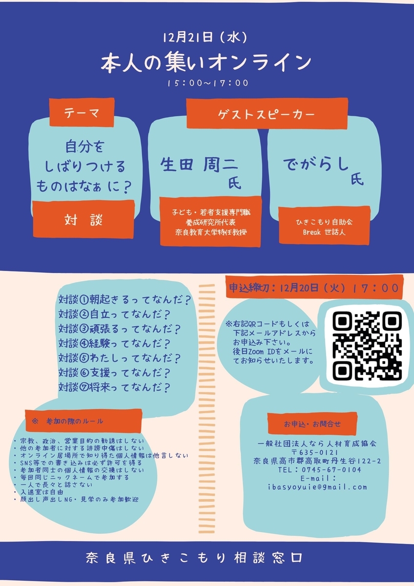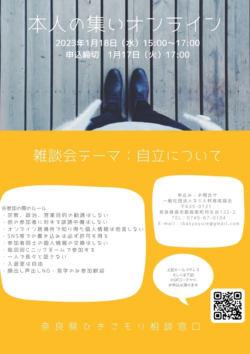 ※「奈良県ひきこもり相談窓口」のプラグラム等は通常は住民対象ですが、このオンラインの集まりについては全国どこにお住まいでも構いません。
