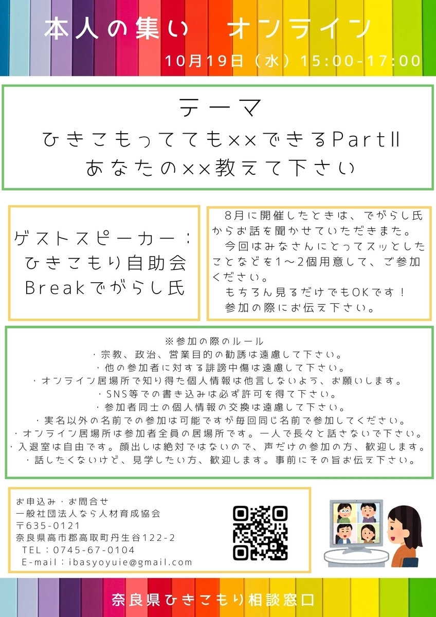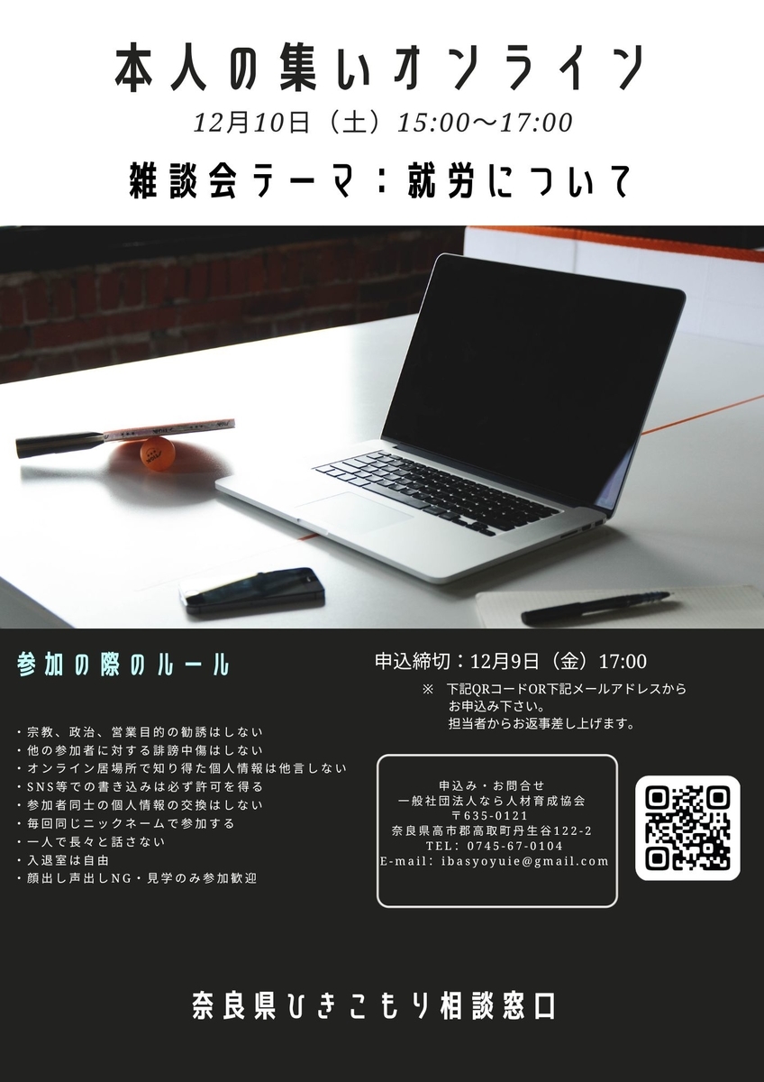 奈良県 青少年・社会活動推進課「奈良県ひきこもり相談窓口」の月1回のオンラインの集まり。